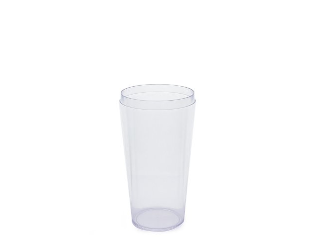 Coqueteleira de acrílico com capacidade de 560ml, possui tampa de encaixe com peneira e um copo pequeno utilizado como tampa.
