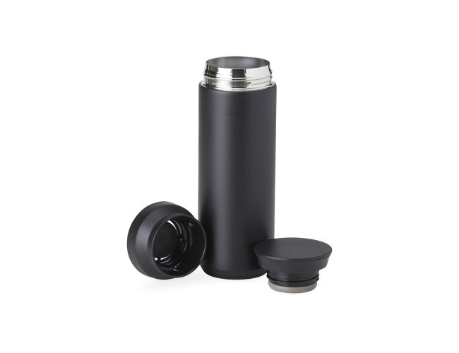 Garrafa térmica feita em inox 304 com parede dupla, capacidade de 470ml. Tampa de abertura dupla.