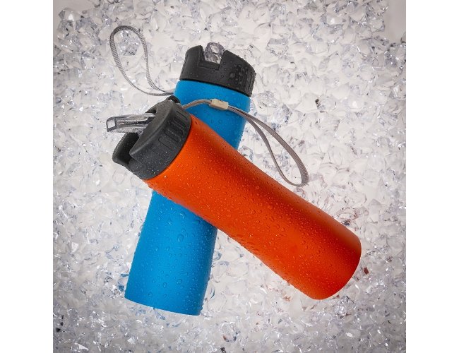 Squeeze em aço inox 600ml com tampa rosqueável plástica e bico transparente de acionamento manual. Acompanha alça de nylon para transporte.