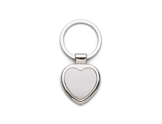 Chaveiro de metal formato coração, possui chapa central em inox e verso brilhante liso.